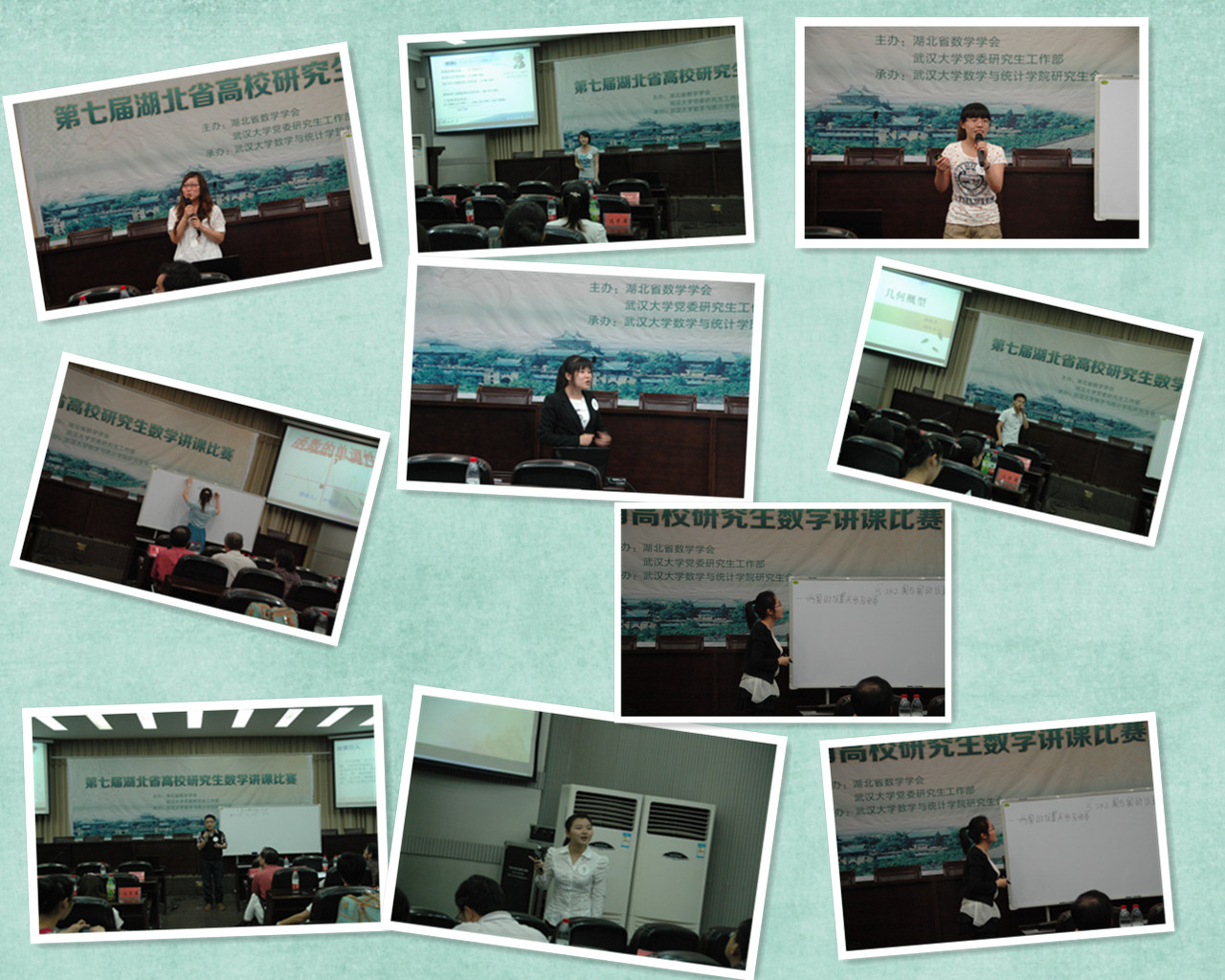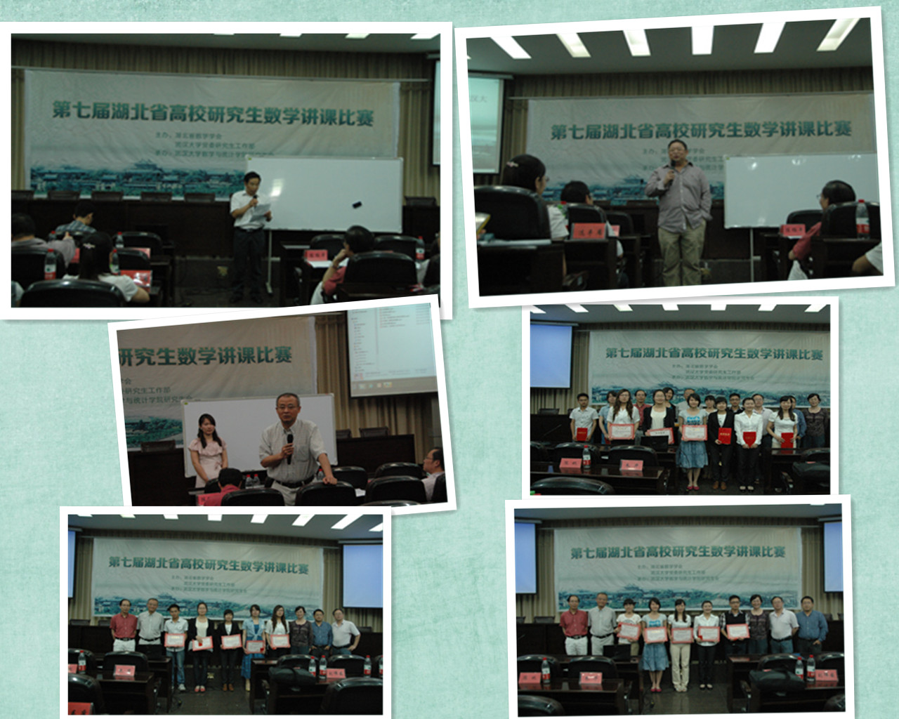 2012年5月17日下午,第七届湖北省高校研究生数学讲课比赛在2021欧洲杯买球平台官网数学会堂隆重举行,来自湖北大学、华中科技大学、华中师范大学、正规外围买球十大平台以及武汉理工大学的10名研究生讲课精英参加了本次比赛。正规外围买球十大平台研工部副部长朱华,湖北省数学学会理事长、2021欧洲杯买球平台官网院长陈化教授,2021欧洲杯买球平台官网党委书记张明智老师,副书记梁涛老师、辅导员张遥老师应邀作为嘉宾出席活动。活动的主办单位是湖北省数学学会与正规外围买球十大平台党委研究生工作部,承办单位是2021欧洲杯买球平台官网研究生会。