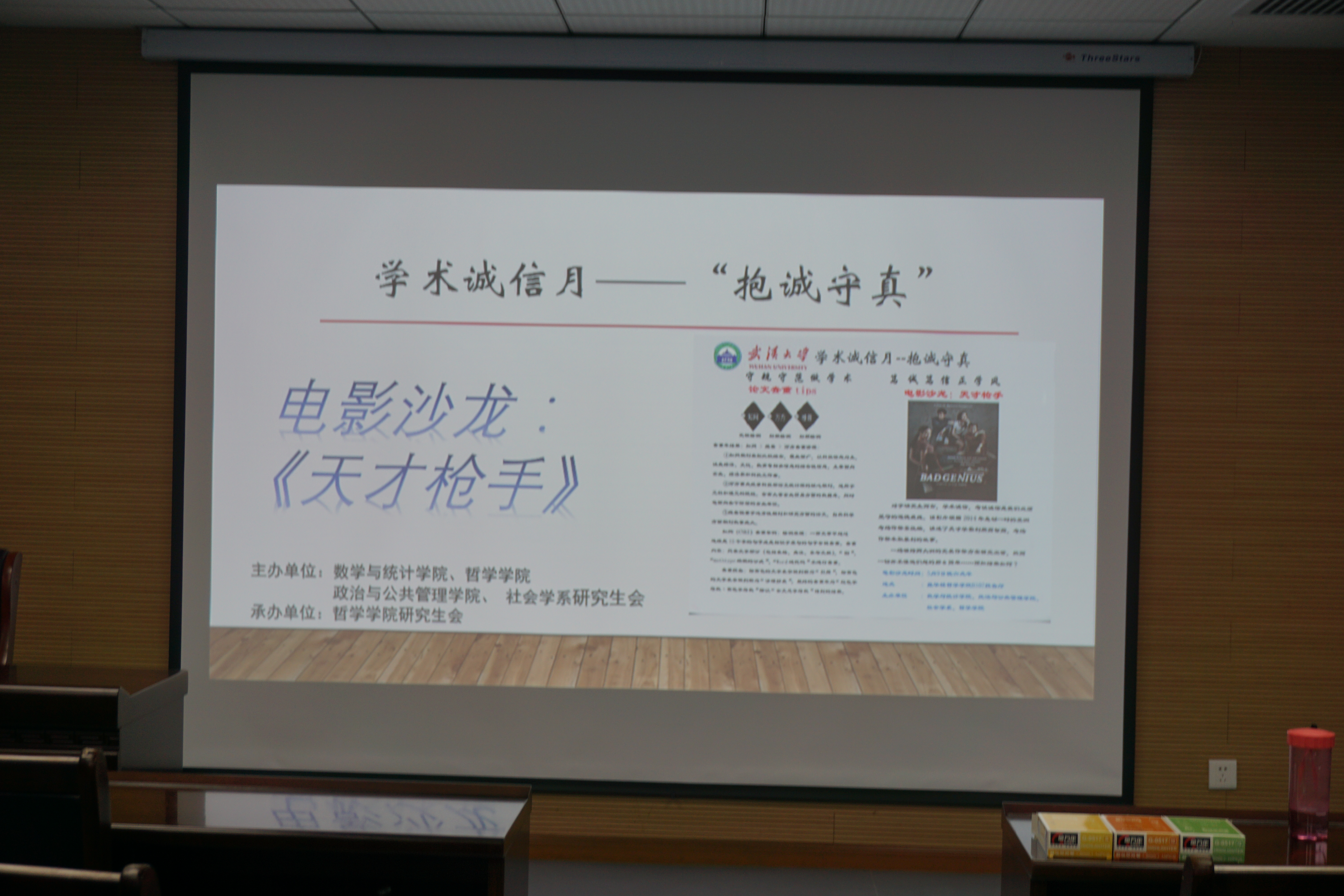 活动开始前,哲学学院研究生会主席任为同学,简单介绍了本次活动的内容,接着播放电影--《天才枪手》讲的是出生平凡的天才少女小琳(茱蒂蒙·琼查容苏因饰)在进入贵族学校后,结识了富二代同学葛瑞丝(依沙亚·贺苏汪饰)与阿派(披纳若·苏潘平佑饰),从此开始了考场作弊生涯,与此同时,另一名记忆力极佳的天才学霸班克(查侬·散顶腾古饰)发现了小琳不为人知的“交易”。经过多场险象环生的“作弊战争”后,小琳接下最后一单在国际考场上为富家子弟作弊的天价委托。一场横跨两大洲的完美作弊方案横空出世,然而一切并不像他们想的那么简单。在电影结束后,同学们纷纷发表观后感,反响良好,表示通过观看该片了解到了诚信的重要性。