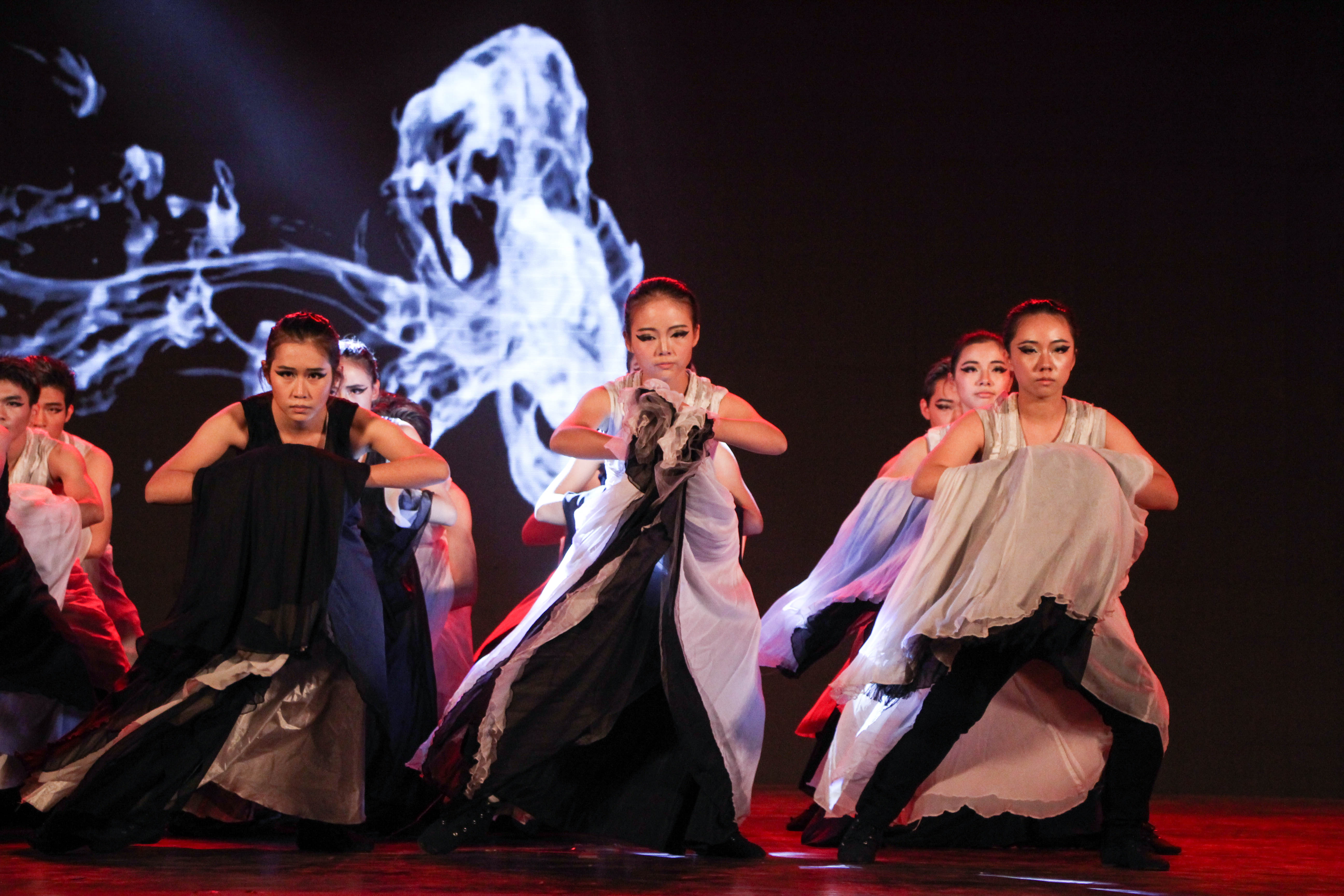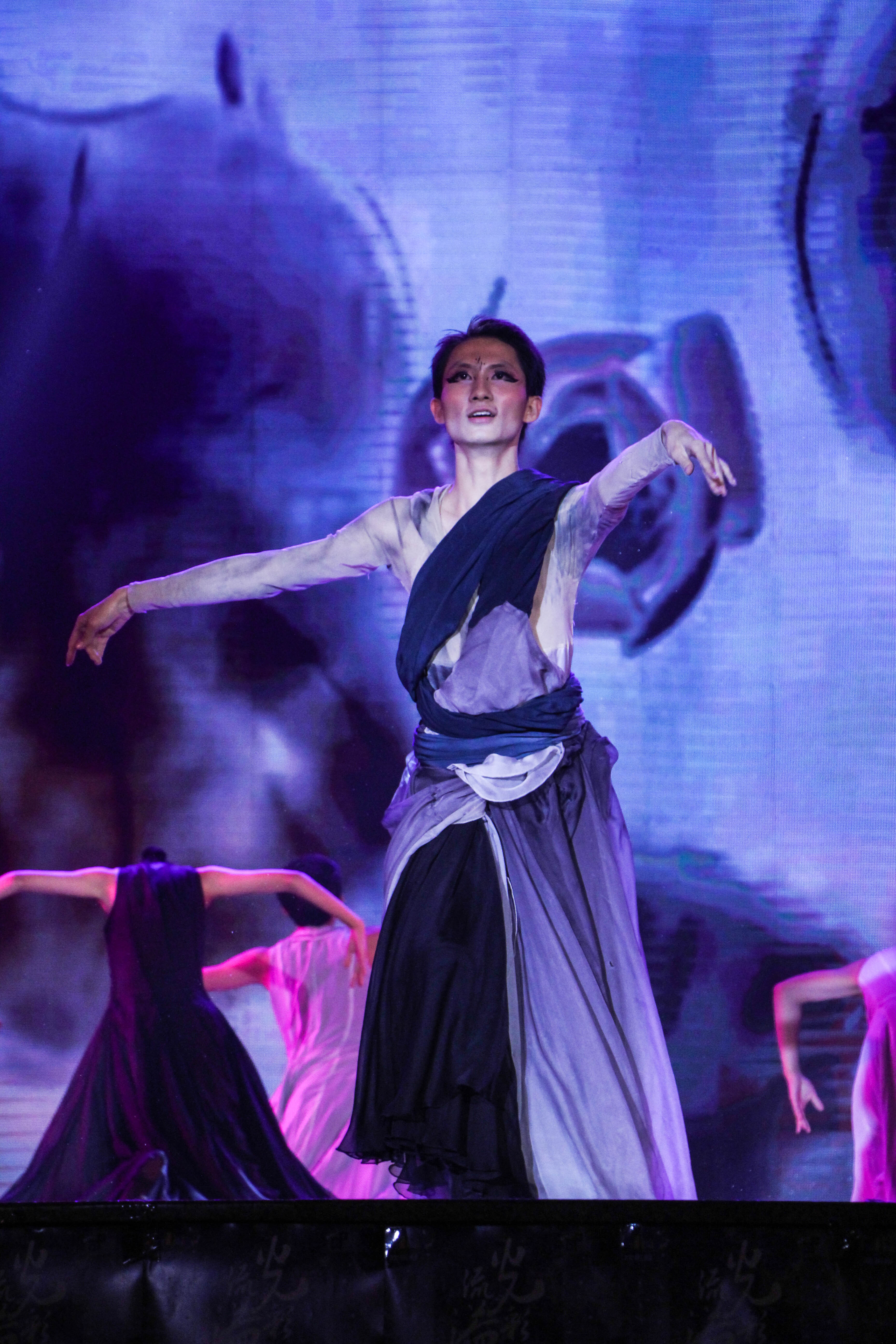 开场,随着隐隐如雷的低沉乐音,和屏幕上无声向前流徙的墨迹,身着白袍的男舞者旋转、跳跃,动静结合,虚实相映。同时,左侧的五位舞者着黑裙,一如缕缕幽墨之魂拥抱着古典人文的月明之夜。接着,如同雪花飘升回天空,又如同羽毛静默的一片片收回,男女舞者的黑白色调和谐相融,飞扬的裙摆似凝墨的如椽之笔。他们眉宇清扬,动作流畅,而舞台上浓淡相宜的色泽更是在观者心中迤逦不去。