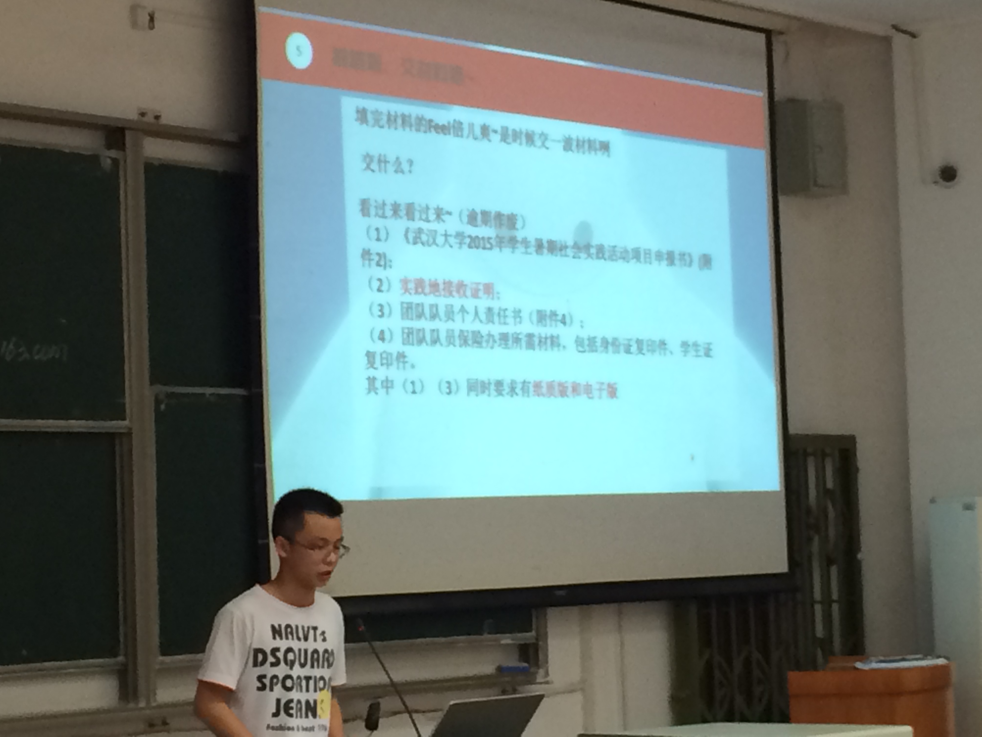 会议结束前,刘宇晖老师进行动员。他告诉我们,刚才介绍的几支队伍的服务对象正是城挑资金的资助对象,前两年的几支实践队伍都取得了不错的成绩,刘老师在鼓励同学们响应号召积极参与社会实践的同时也特别叮嘱大家应注意安全,提醒大家关注宣传,提前联系媒体等。