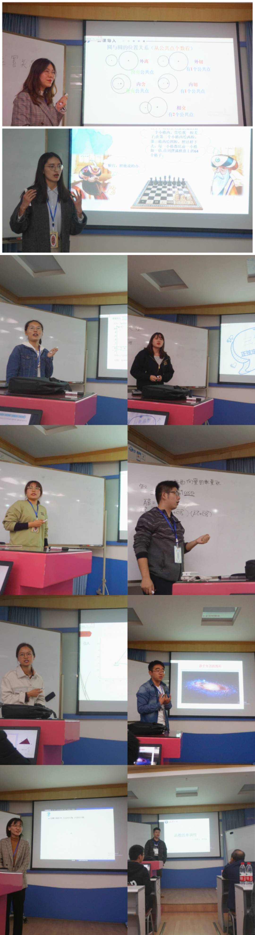 主持人简要介绍了本次讲课比赛的评分规则后,比赛正式拉开了帷幕。参加本次比赛的10名选手赛前通过抽签决定出场顺序,五人一组,每组讲课结束后,评委进行点评。参赛选手可采用多媒体、板书等多种形式,每人讲课时间限定10分钟。本次参赛选手们准备的课题涵盖了高中数学许多重要的知识,如函数的单调性、圆与圆的位置关系、正余弦定理、向量内积、椭圆等。 “老师们”根据课件展示,结合板书内容,通过举例子、画图像、打比方等多种方式,将同学们引入到新知识的学习中。他们注重教学情境设计,积极引导同学们拓展思维;他们声情并茂,在讲解的同时还注重台下的观众互动,调动起“模拟课堂”的课堂气氛。